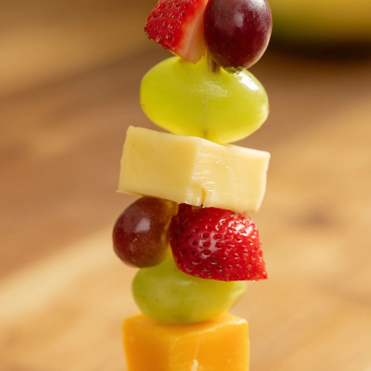- Thread ingredients onto each skewer in alternating patterns—grape, cheese, strawberry, cheese, pineapple creates a beautiful rhythm. Leave a bit of space at both ends so people can grab them without touching the food.