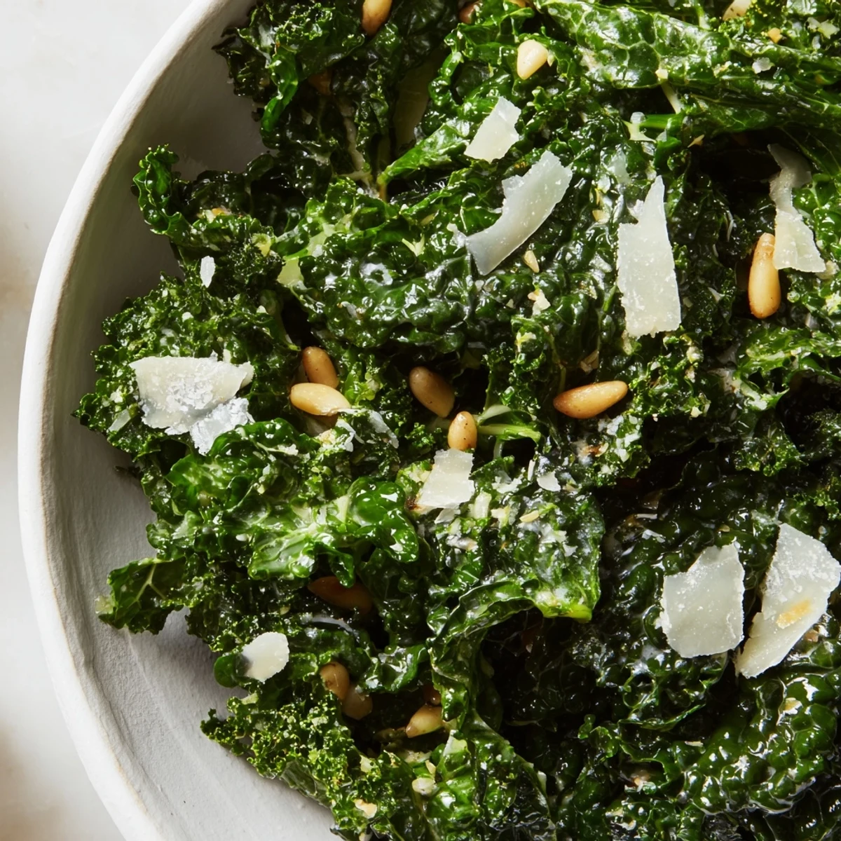- Pour that vibrant dressing over the softened kale toss thoroughly then scatter Parmesan and toasted nuts across the top.