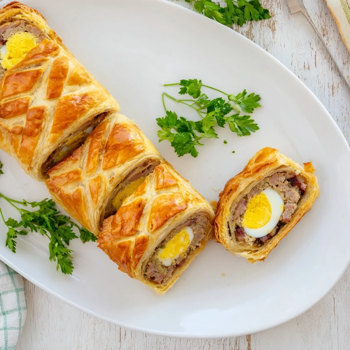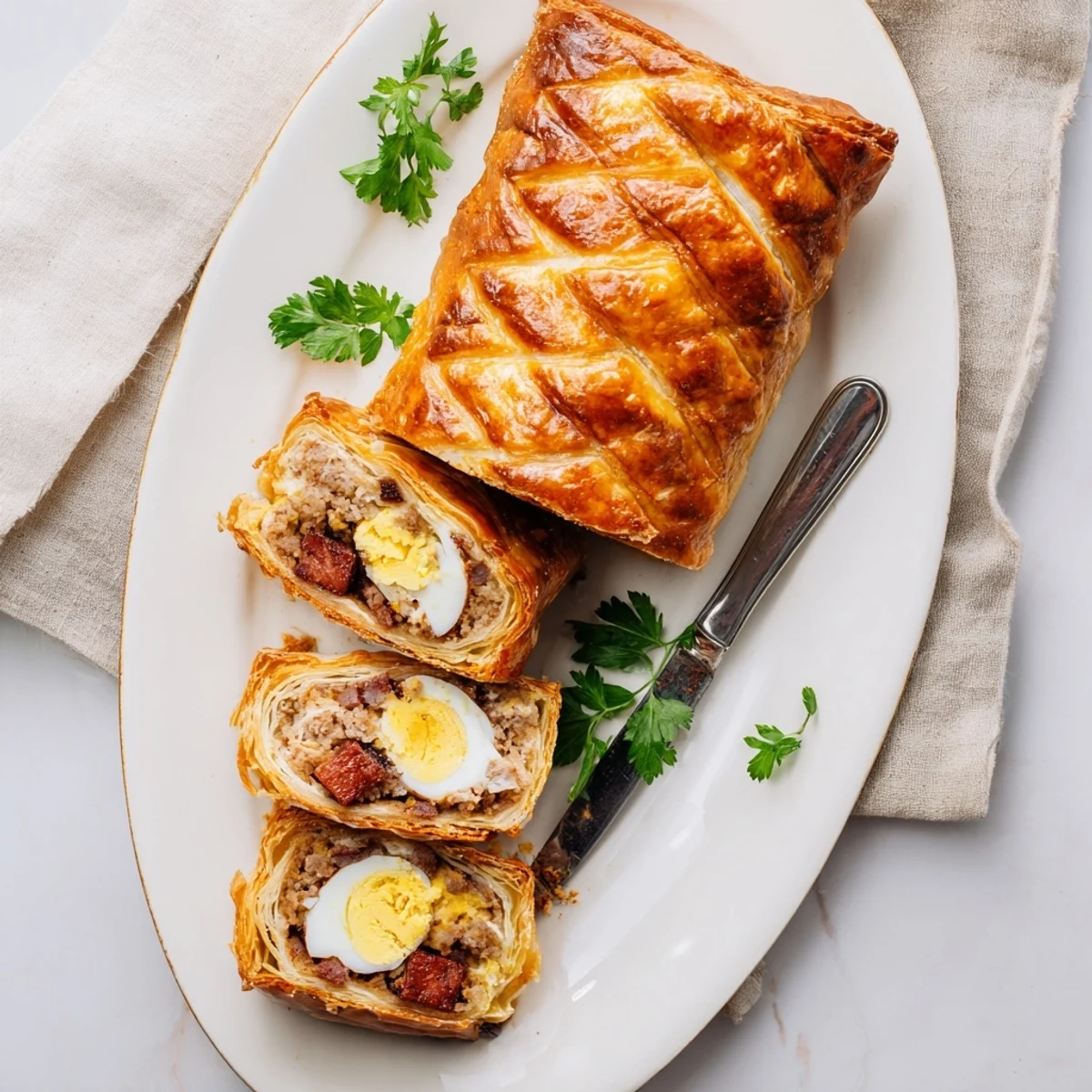 This impressive creation combines quality pork sausage meat with cured chorizo, aromatic onion, garlic, and smoked paprika. The mixture is shaped around soft-boiled eggs, then encased in buttery puff pastry and baked until golden. The result is a stunning centerpiece that delivers layers of flavor and texture — crisp pastry, savory spiced meat, and creamy egg centers.