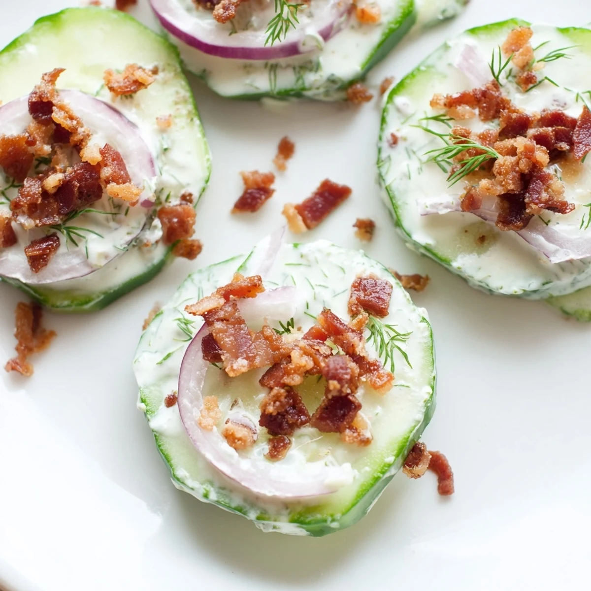 This vibrant salad combines juicy cucumbers and red onions with crispy bacon pieces, all coated in a creamy yogurt-based dressing with apple cider vinegar and Dijon mustard. The fresh dill adds brightness while the tangy vinaigrette brings everything together. Perfect for meal prep, this dish actually improves after chilling, making it ideal for make-ahead lunches or potluck gatherings.