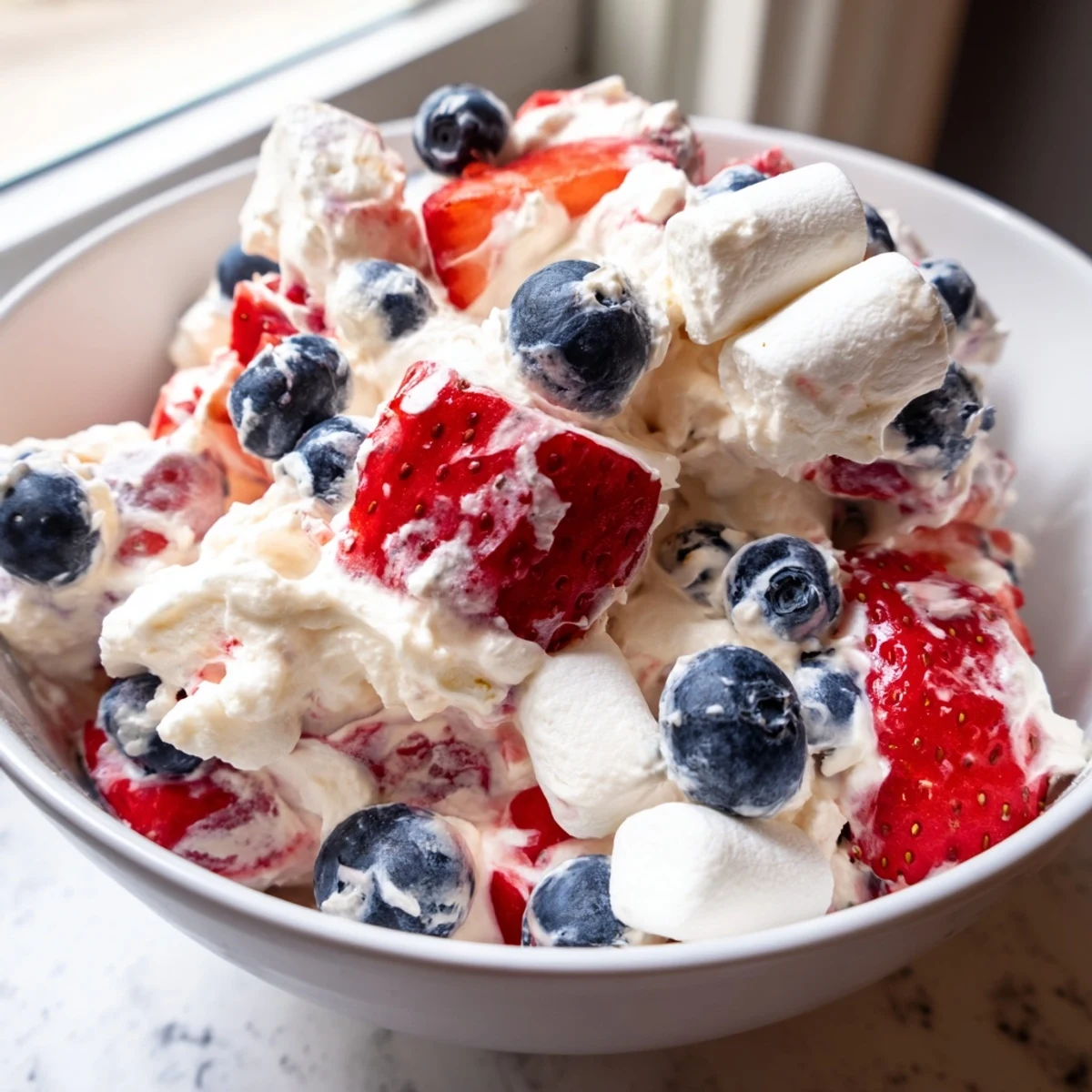 - Fold in the strawberries and blueberries until they're evenly coated, then add the mini marshmallows and give it one final gentle fold.